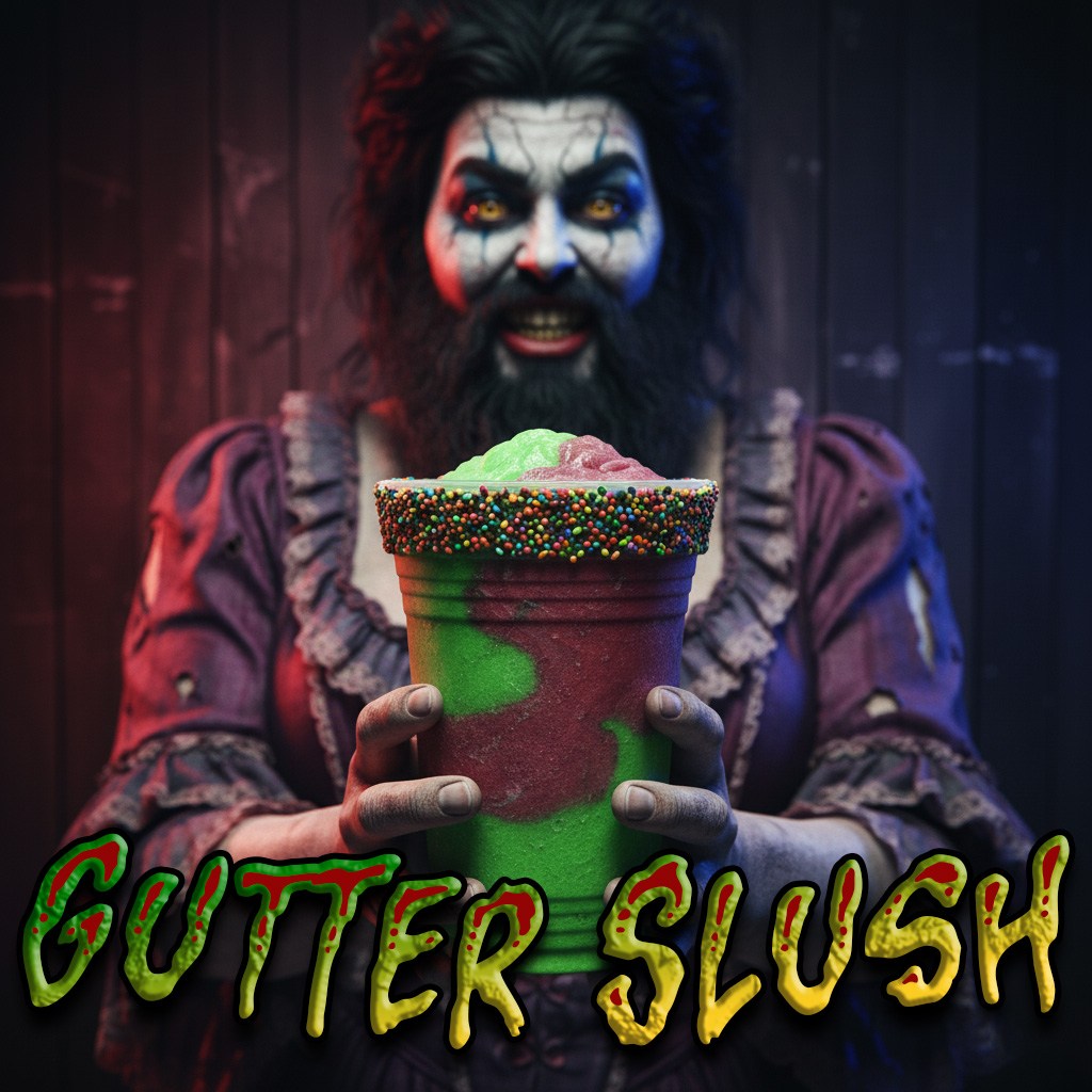 "Grizelda's Gutter Slush" is not your average thirst-quencher. This is a swirling, sickening symphony of flavor and visual assault. Witness two conflicting, unnatural colors (like electric lime green battling a putrid purple, or a sickly blue raspberry clashing with a viscous red cherry) haphazardly poured together. The result? A muddy, aggressive, and utterly toxic-looking concoction that shimmers like the stagnant pools found beneath the carnival's decaying rides.