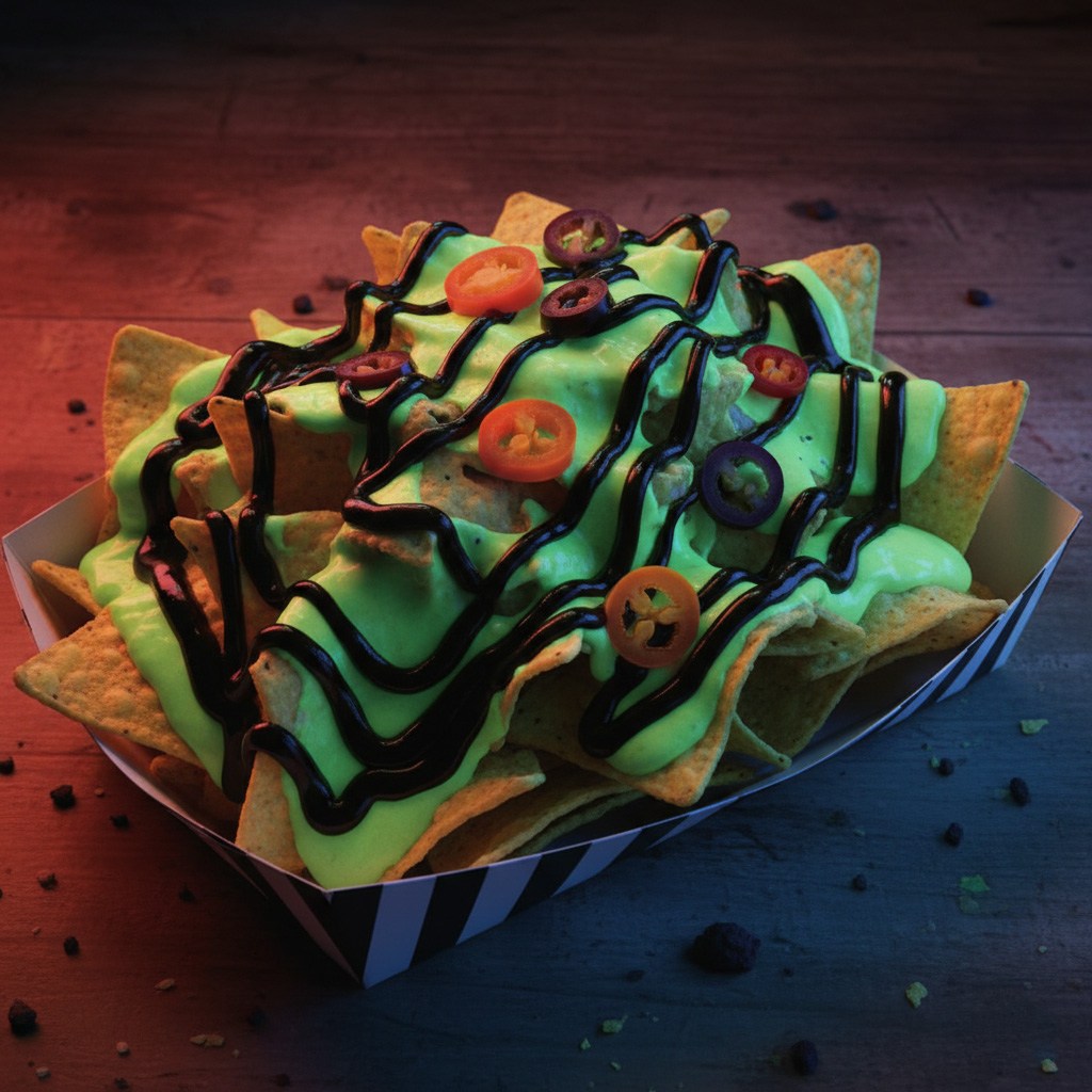 Your favorite crunchy tortilla chips serve as the foundation for this masterpiece of madness, but the merriment stops there. Drenched in a sickly, glowing green (or neon yellow) cheese sauce, it shimmers with an unnatural, chemical luminescence – the very pallor of a clown's decaying smile.