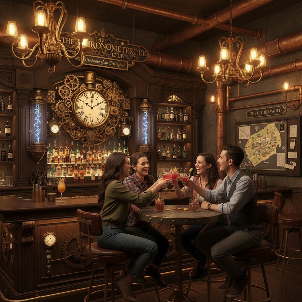 Your adventure doesn't have to end when the clock stops ticking. Adjacent to our thrilling escape rooms, you'll find The Chronometer Club – our exclusive, steampunk-inspired bar and lounge. It’s the perfect setting to unwind, dissect your escape strategies, and toast to your team's genius (or commiserate over a near-miss!). Enjoy a curated selection of craft cocktails, fine spirits, and local brews in an atmosphere that extends the unique charm of The Clockwork Labyrinth.
